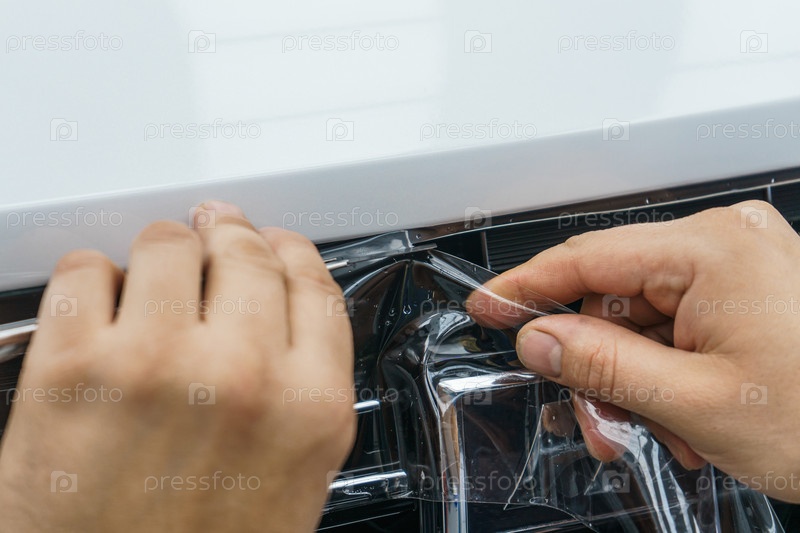 Рабочий режет прозрачную пленку на автомобиле, чтобы защитить его от гравия и царапин на капоте белого автомобиля. Нанесение прозрачной защитной пленки на краску