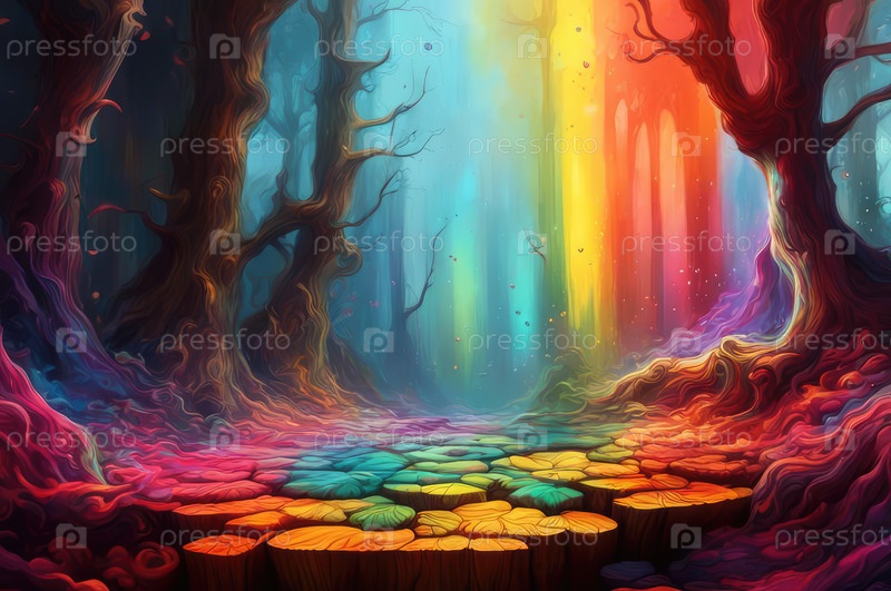 Красочная иллюстрация леса и реки. Сказочный пейзаж. Галлюцинации