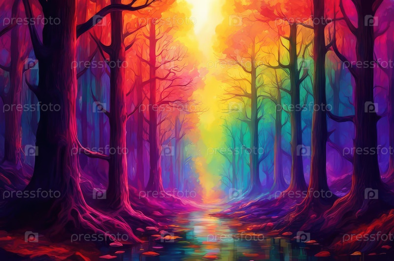 Красочная иллюстрация леса и реки. Сказочный пейзаж. Галлюцинации