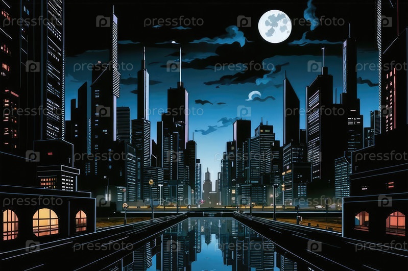 Плоская абстрактная иллюстрация ночного города. Футуристический город. Картинка для общей иллюстрации без деталей