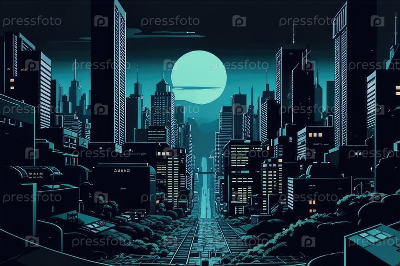 Плоская абстрактная иллюстрация ночного города. Футуристический город. Картинка для общей иллюстрации без деталей