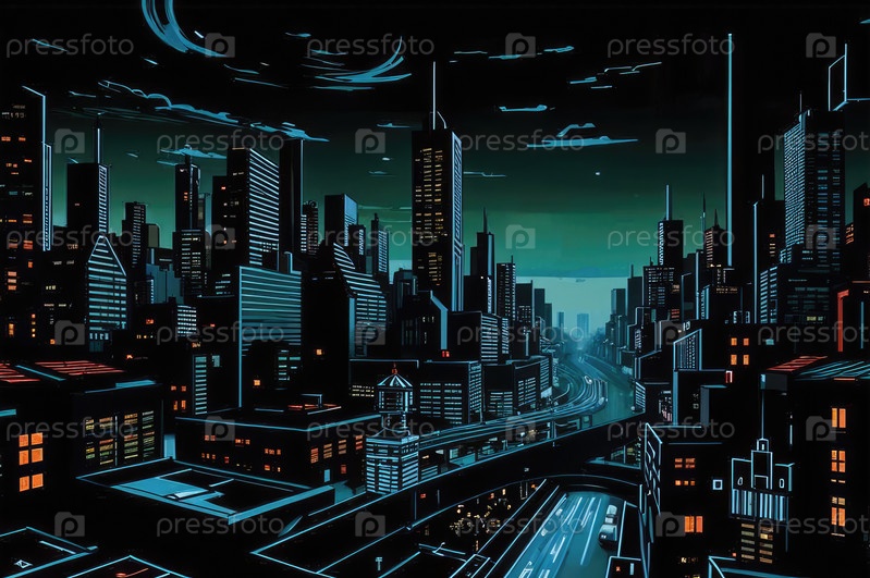 Плоская абстрактная иллюстрация ночного города. Футуристический город. Картинка для общей иллюстрации без деталей
