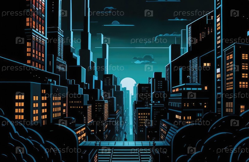 Плоская абстрактная иллюстрация ночного города. Футуристический город. Картинка для общей иллюстрации без деталей