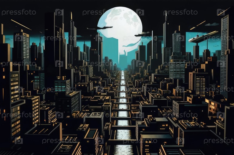 Плоская абстрактная иллюстрация ночного города. Футуристический город. Картинка для общей иллюстрации без деталей