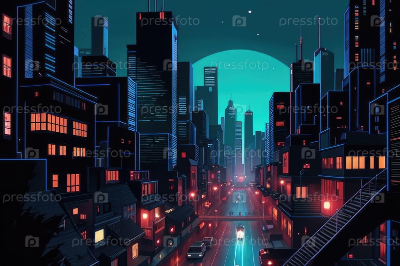 Плоская абстрактная иллюстрация ночного города. Футуристический город. Картинка для общей иллюстрации без деталей