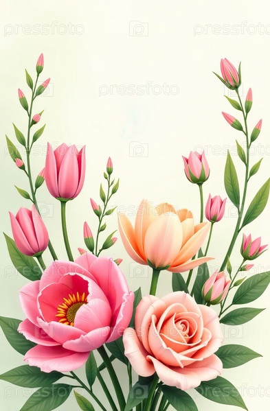 Яркая и праздничная открытка. Красивый букет весенних цветов в нежных пастельных тонах. Простой светлый фон