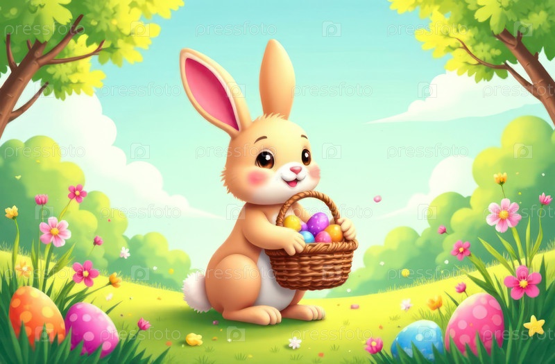 Маленький кролик и крашеные яйца в корзине на весенней зеленой траве. Милый кролик. Пасхальная охота за яйцами с домашним кроликом