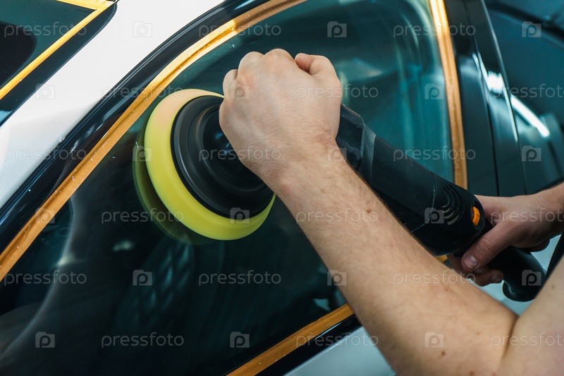 Забота о внешнем виде автомобиля. Мастер полирует дверное стекло автомобиля. Детейлинг