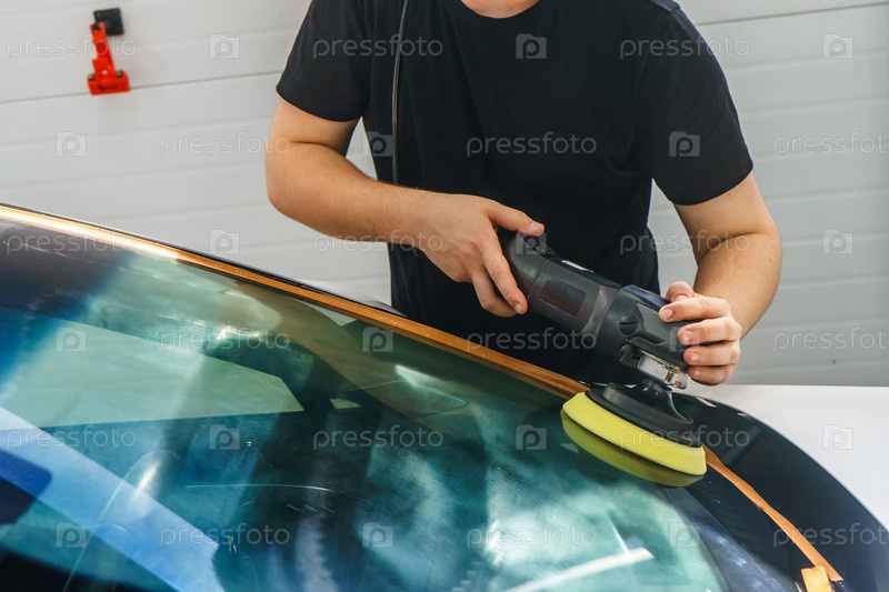 Забота о внешнем виде автомобиля. Мастер полирует лобовое стекло автомобиля. Детейлинг