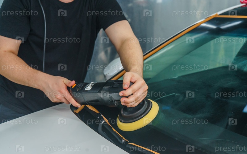 Забота о внешнем виде автомобиля. Мастер полирует лобовое стекло автомобиля. Детейлинг