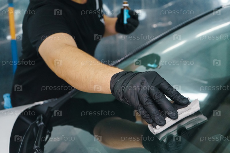 Мастер в черных перчатках наносит нанозащитное покрытие на лобовое стекло автомобиля. Студия детейлинга