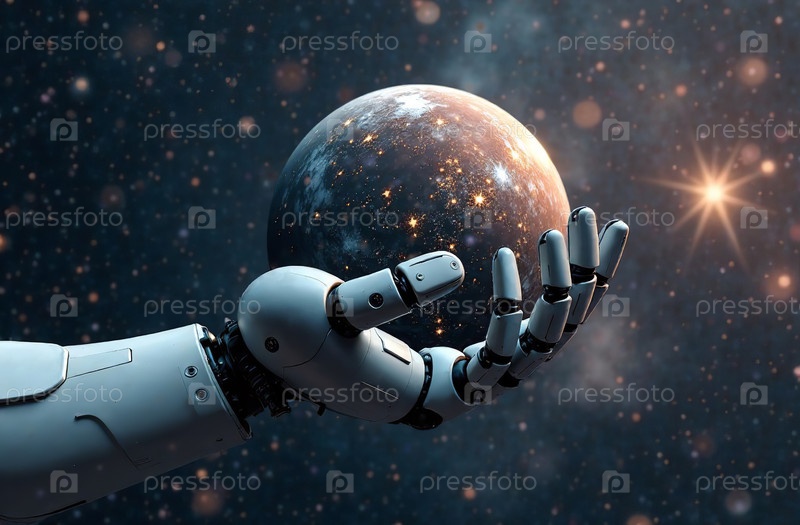 Робот-астронавт космос, искусственный интеллект держит планету руками. Генеративный ИИ