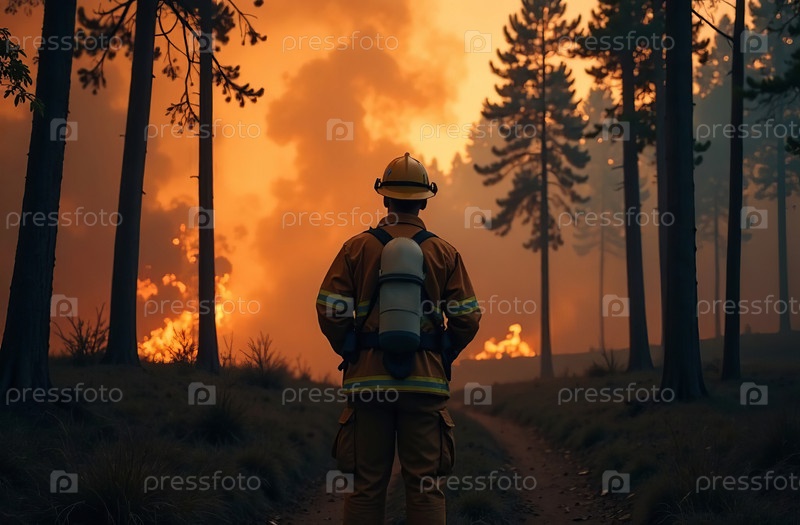Пожарный на фоне лесного пожара, аварийно-спасательная служба. Генеративный искусственный интеллект