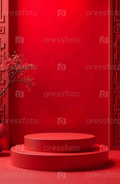 Подиум косметических продуктов на красном фоне, свободное место для товаров. Генеративный ИИ