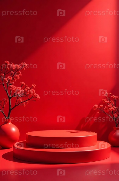 Подиум косметических продуктов на красном фоне, свободное место для товаров. Генеративный ИИ