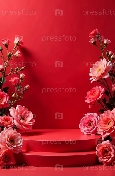 Подиум косметических продуктов на красном фоне, свободное место для товаров. Генеративный ИИ