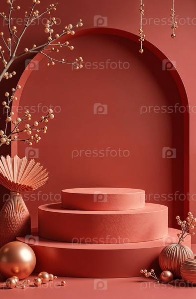Подиум косметических продуктов на красном фоне, свободное место для товаров. Генеративный ИИ
