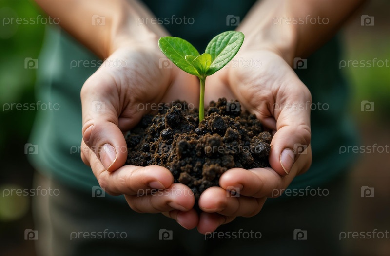 Руки держат горсть почвы, молодой зеленый росток, защита экологии. Генеративный искусственный интеллект