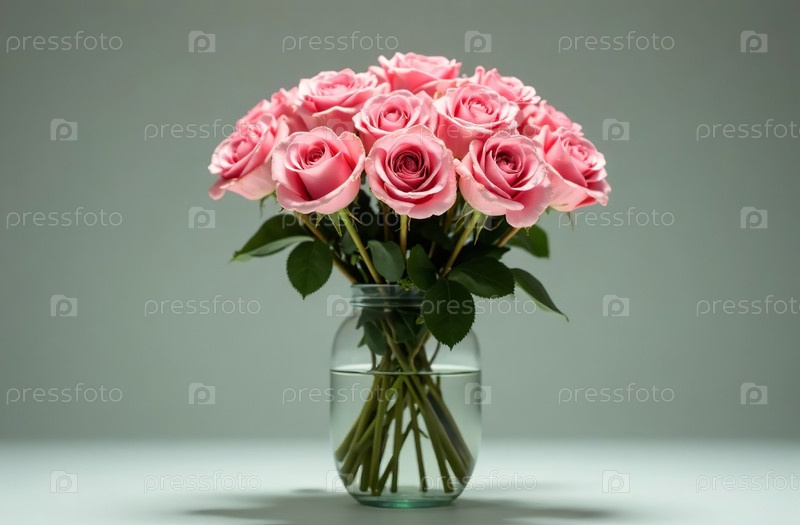 Букет розовых роз в стеклянной вазе, стоящий на столе, цветочный декор. Генеративный искусственный интеллект