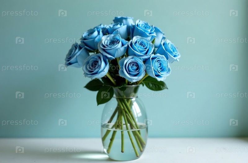 Букет синих роз в стеклянной вазе, стоящий на столе, цветочный декор. Генеративный искусственный интеллект