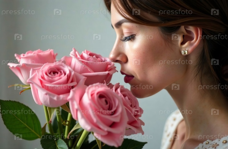 Женщина нюхает букет розовых роз, женский цветочный аромат. Генеративный искусственный интеллект