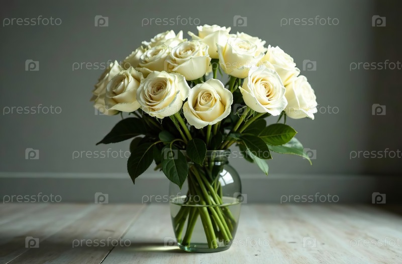 Букет белых роз в стеклянной вазе, стоящий на столе, цветочный декор. Генеративный искусственный интеллект