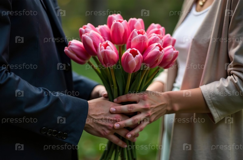 Мужчина дарит женщине букет розовых тюльпанов, больших красивых цветов. Генеративный искусственный интеллект