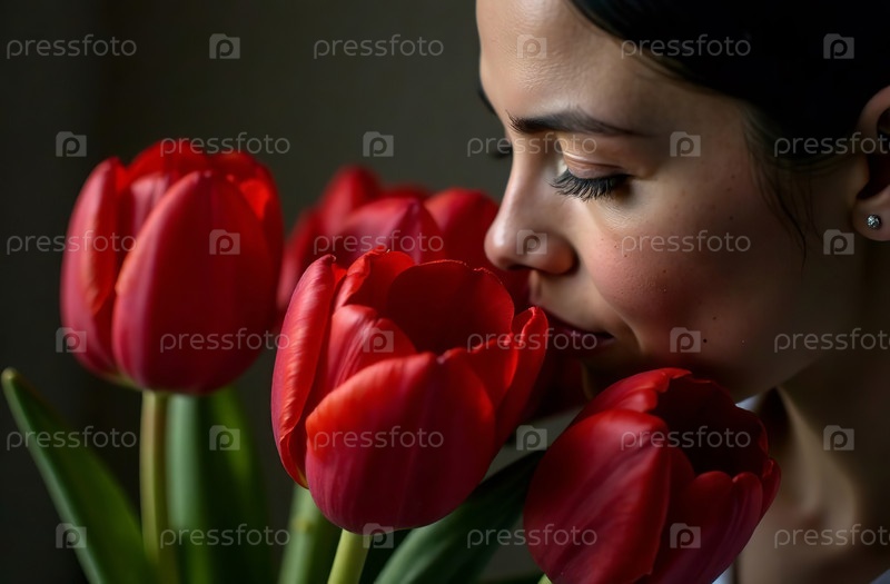 Женщина нюхает букет красных тюльпанов, женский цветочный аромат. Генеративный ИИ