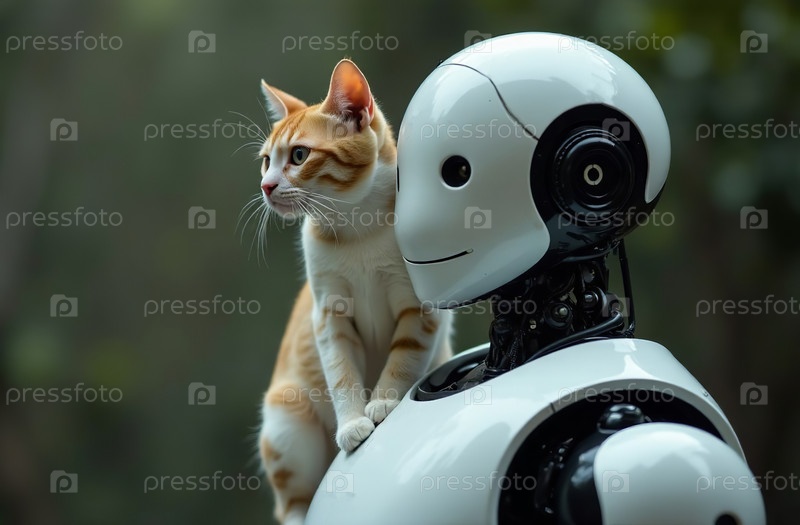 Робот-киборг-гуманоид держит на плече пушистого кота в парке. Генеративный искусственный интеллект