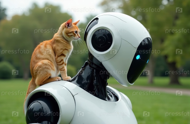 Робот-киборг-гуманоид держит на плече пушистого кота в парке. Генеративный искусственный интеллект