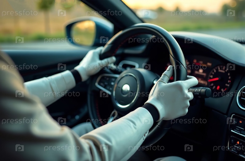 Робот с искусственным интеллектом управляет автомобилем, рука на руле. Генеративный ИИ