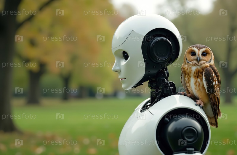 Робот-киборг-гуманоид держит домашнюю птицу сову на плече в парке. Генеративный искусственный интеллект
