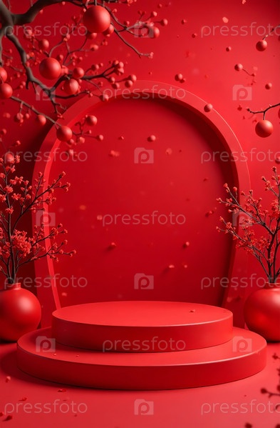 Подиум косметических продуктов на красном фоне, свободное место для товаров. Генеративный ИИ