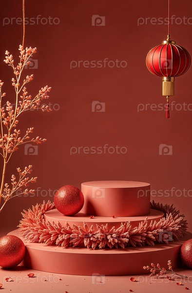 Подиум косметических продуктов на красном фоне, свободное место для товаров. Генеративный ИИ