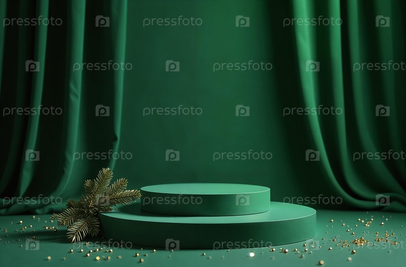 Презентационный стенд для продукта с зеленой драпировкой, рождественский, новогодний. Создано с помощью искусственного интеллекта