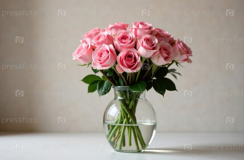 Букет розовых роз в стеклянной вазе, стоящий на столе, цветочный декор. Генеративный искусственный интеллект