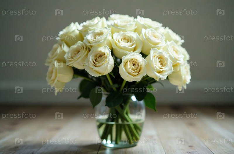 Букет белых роз в стеклянной вазе, стоящий на столе, цветочный декор. Генеративный искусственный интеллект