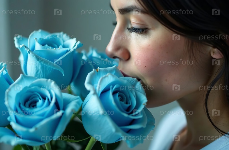 Женщина нюхает букет синих роз, женский цветочный аромат. Генеративный искусственный интеллект