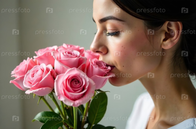 Женщина нюхает букет розовых роз, женский цветочный аромат. Генеративный искусственный интеллект