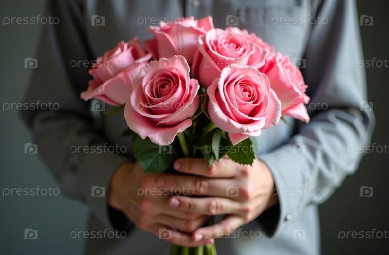 Мужчина держит букет розовых роз, подарочный аромат крупных цветов. Генеративный искусственный интеллект