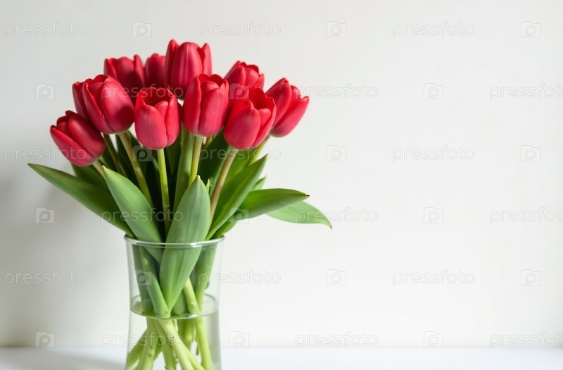 Букет красных тюльпанов в стеклянной вазе на столе, цветочный декор. Генеративный искусственный интеллект