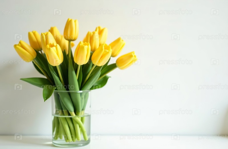 Букет желтых тюльпанов в стеклянной вазе, стоящей на столе, цветочный декор. Генеративный искусственный интеллект