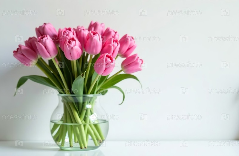 Букет розовых тюльпанов в стеклянной вазе на столе, цветочный декор. Генеративный искусственный интеллект