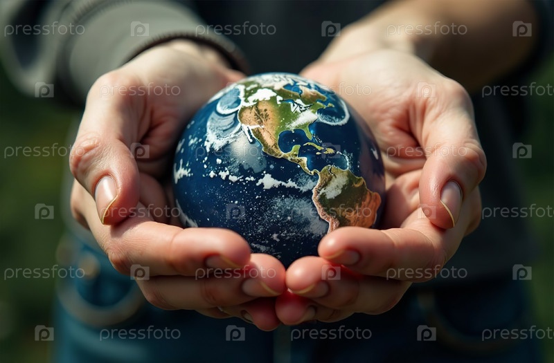 Руки держат маленькую планету Земля, защита окружающей среды. Генеративный искусственный интеллект
