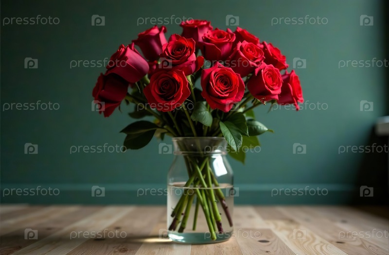 Букет красных роз в стеклянной вазе, стоящий на столе, цветочный декор. Генеративный искусственный интеллект