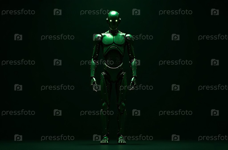 Человекоподобный робот стоит в полный рост на черном фоне. Генеративный искусственный интеллект