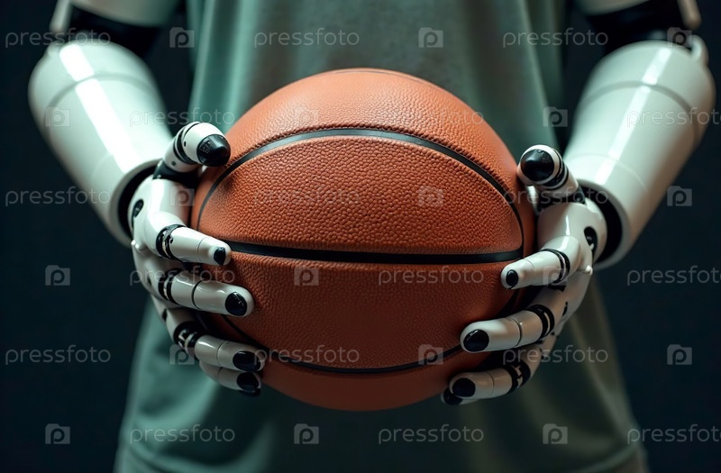 Робот-игрок с искусственным интеллектом держит баскетбольный мяч в руке. Генеративный ИИ