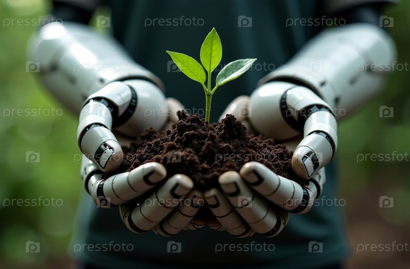 Робот-эколог искусственный интеллект держит росток почвы в руках. Генеративный ИИ
