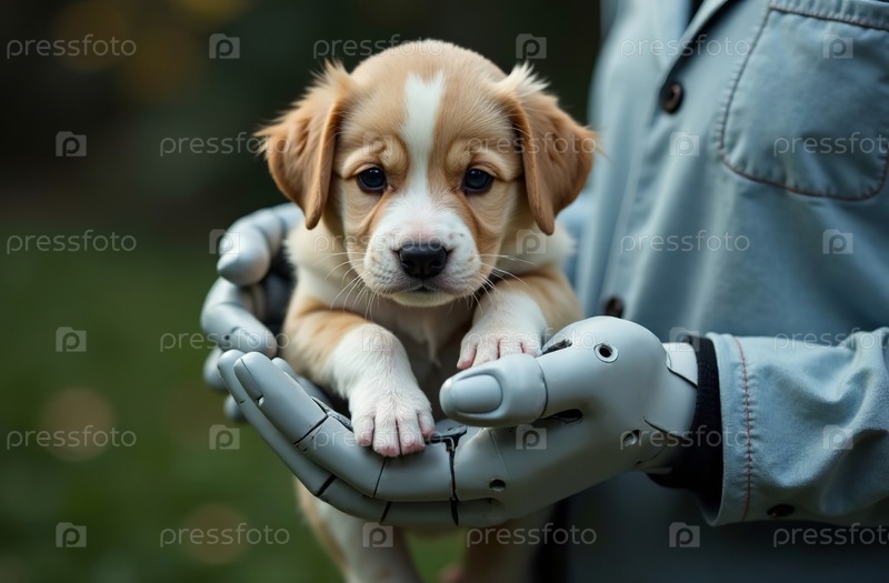 Робот с искусственным интеллектом, держащий маленькую собаку, милый щенок. Генеративный ИИ