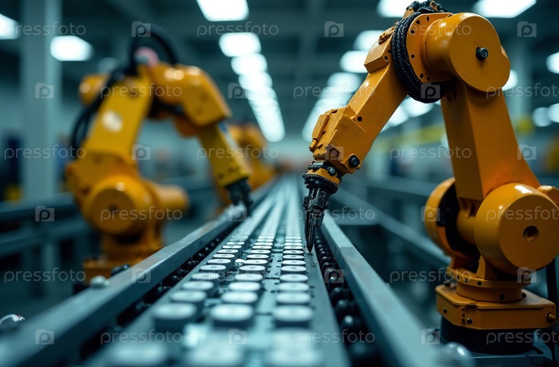 Автоматизированный робот вручную собирает запасную часть на конвейере завода. Генеративный искусственный интеллект